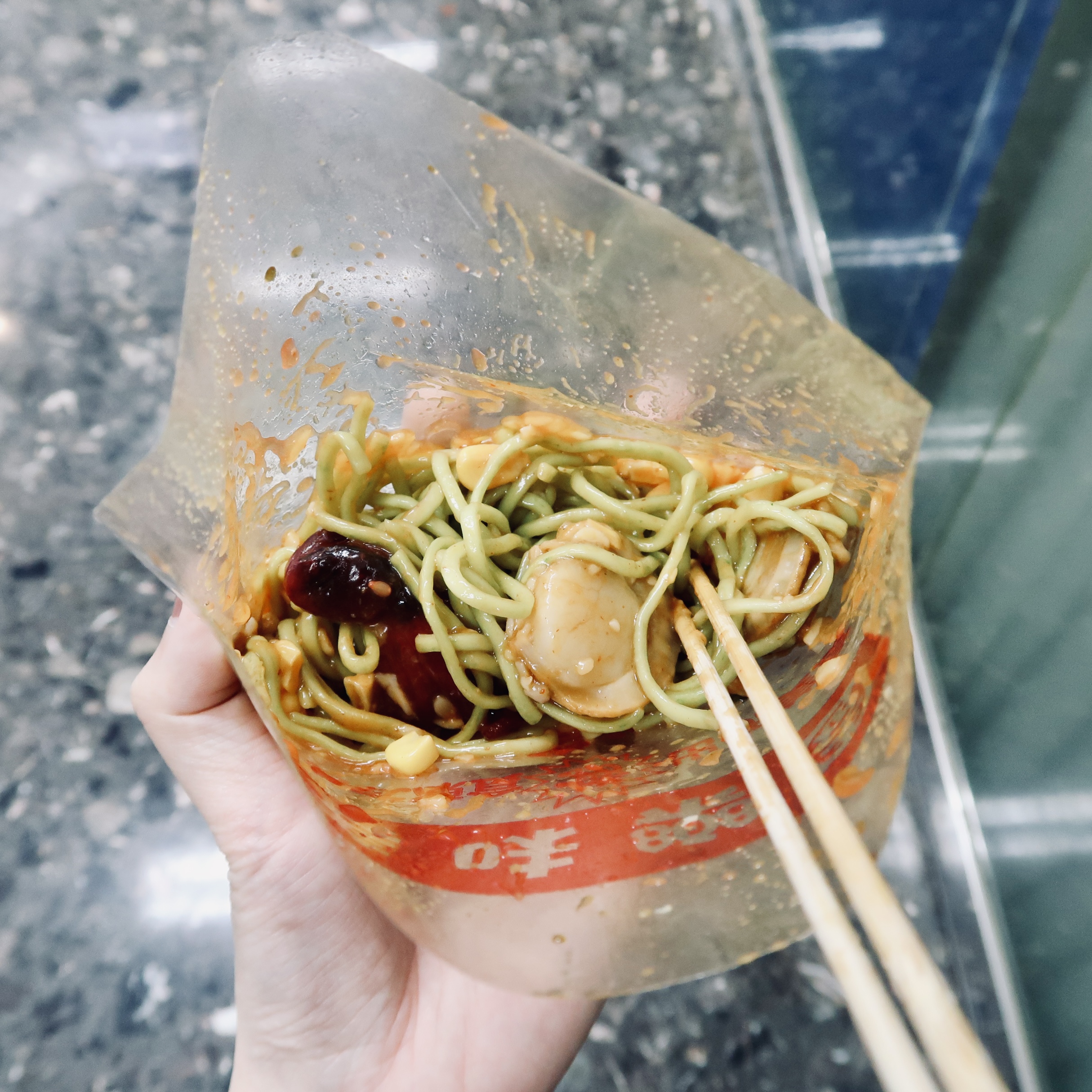 放學後來到冷麵舖,大家都會有默契地拿起膠籃,邊手執起想要的食材,邊和朋友討論下一個選擇。有時若想要的食材只剩一包,便需要猜包剪揼分出勝負。聰明一點的,則會預先和朋友商量好把食材交換享用,讓三餸變成六餸。盛好食材後,把膠籃遞給阿姨,對方便會熟練地把食材倒在一起,加入蒜泥及辣醬,再拿到攪拌機下拌勻。隨著機器發出的「𠾐𠾐」聲響,散發出的強烈蒜香,一包豐盛的平價撈冷麵便告完成,不少學生更喜歡拿著竹籤邊逛街邊食。