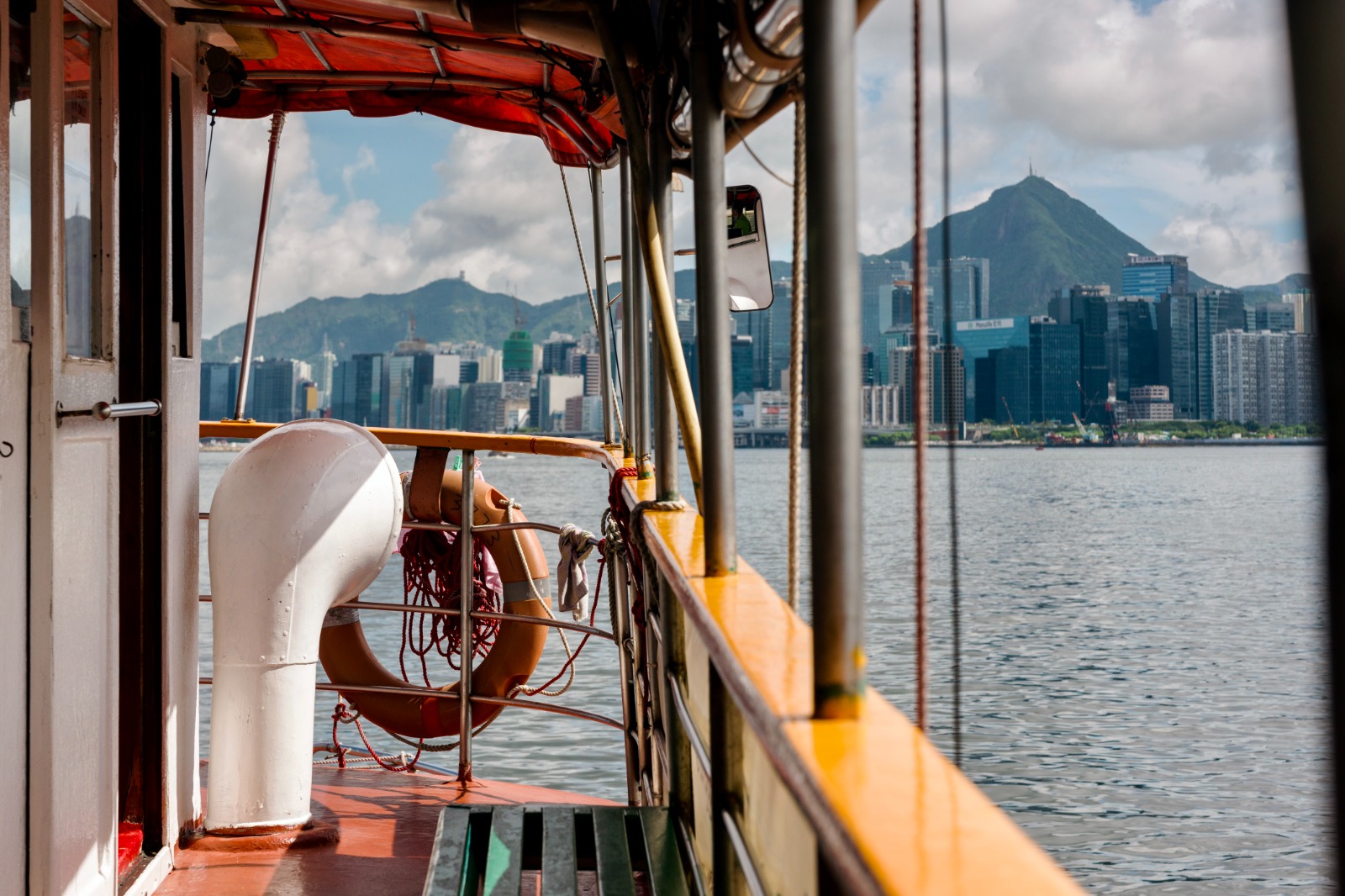 坐在船側的范先生,幾乎整段船程都欣賞沿途景色。「跟天星小輪比,這裡的維港闊得多!那邊現在(船程)連7-8分鐘都不知道有沒有,但這邊至少可以坐20分鐘,而且是這種慢船(渡輪)——北角那條航線現在已轉了快船。」從西灣河出發,映入眼簾的先是近年發展急速的鰂魚涌太古一帶商業大廈,玻璃幕牆在陽光下閃閃發亮;此時若轉而眺望對岸,則見鯉魚門附近山上亦建起了新住宅樓宇。「我一般喜歡看山,天氣好的時候會看到獅子山。鯉魚門一帶(的山勢)變化較多,近年起了愈來愈多樓。」遠處的獅子山、飛鵝山、魔鬼山;近岸的啟德郵輪碼頭、觀塘避風塘、還有堤壩上的白鷺,20分鐘的船程就如范先生所言,是一場城市生活中的little getaway,為自己開闢一個「透氣」的空間。